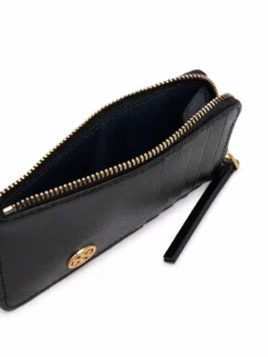 Black calf leather logo-plaque cardholder from TORY BURCH featuring gold-tone logo plaque, card slots, top zip fastening and main compartment.