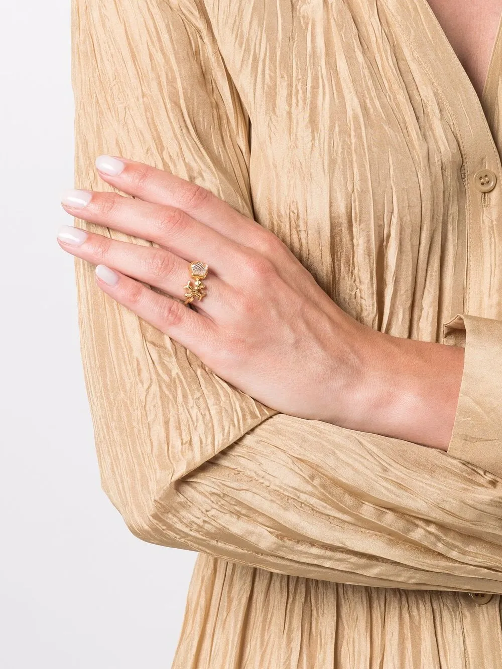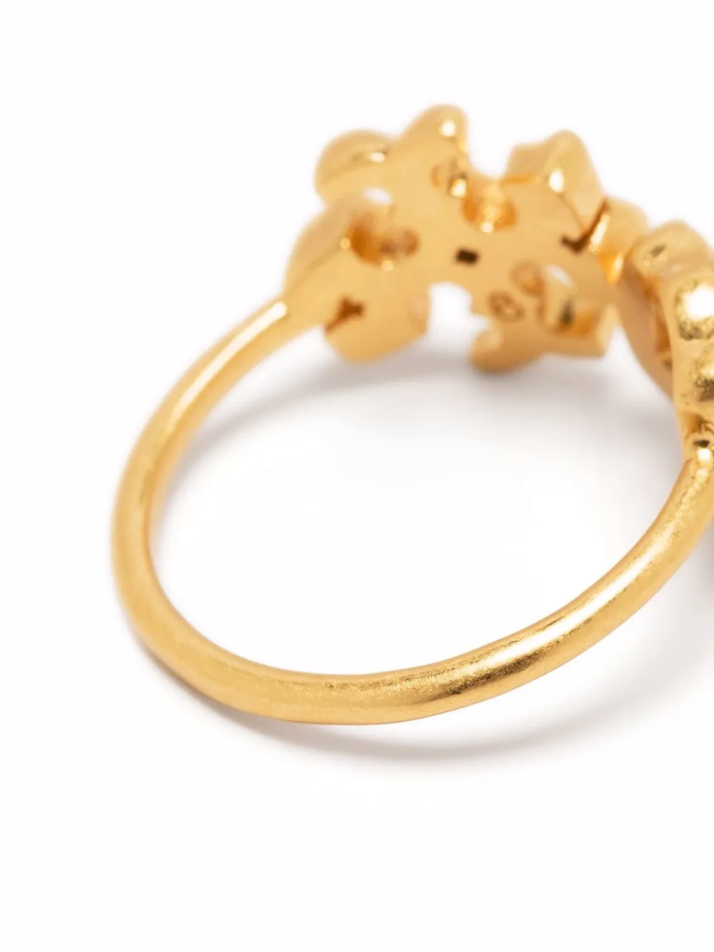 The Roxanne line-up from Tory Burch offers a timeless aesthetic. This ring is presented in gold-tone brass with a sparkling crystal embellishment.