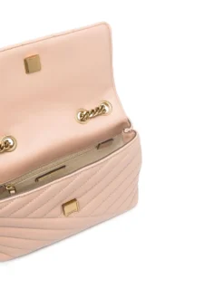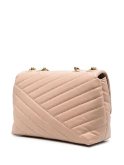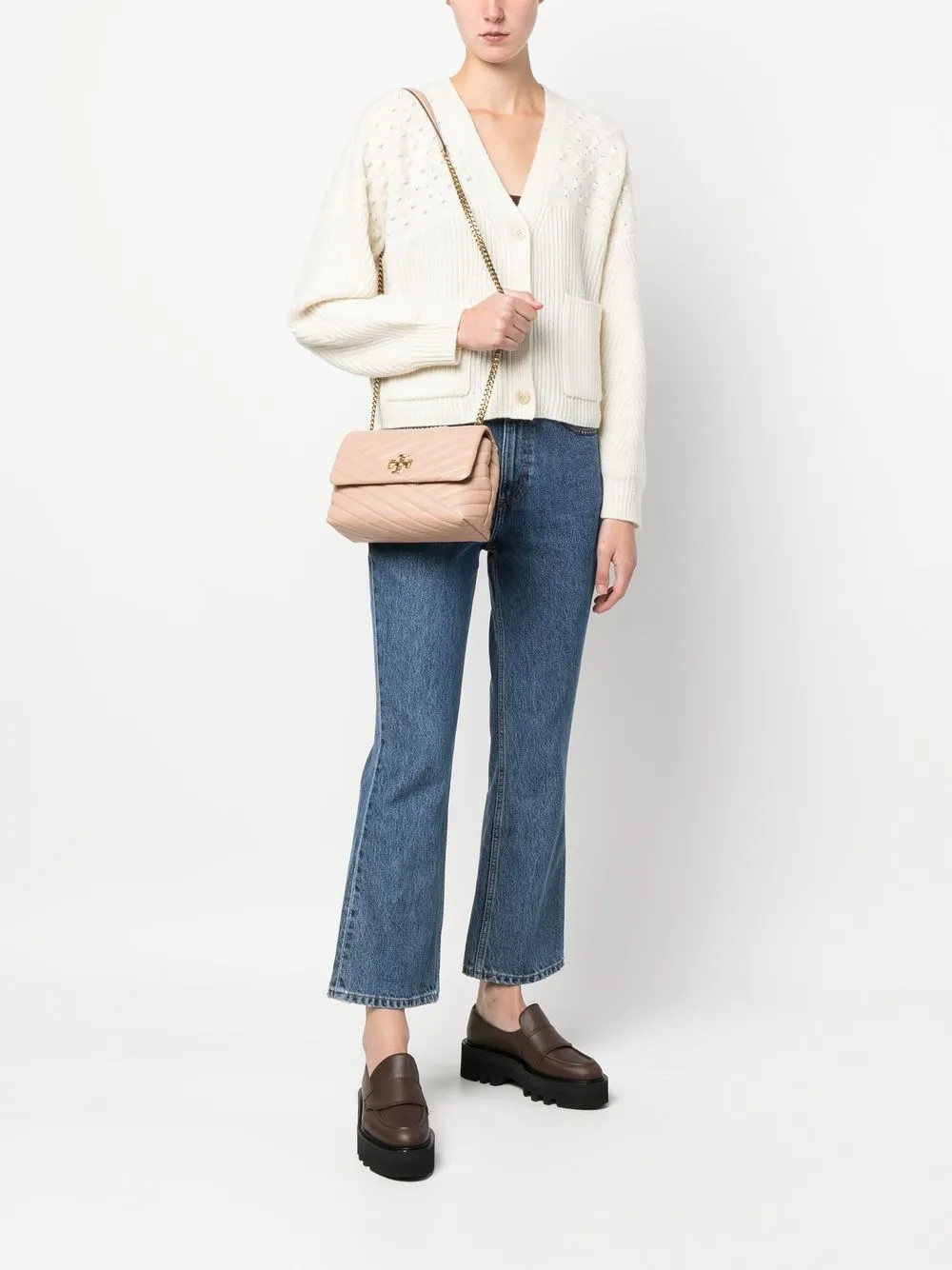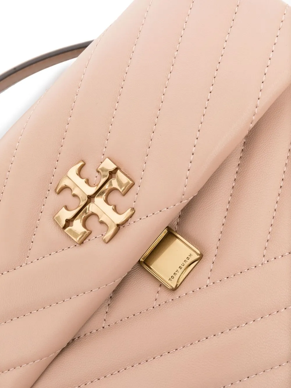 Kira quilted crossbody bag from TORY BURCH featuring blush beige, calf leather, quilted, logo plaque, foldover top with press-stud fastening, chain-link shoulder strap and main compartment.