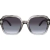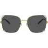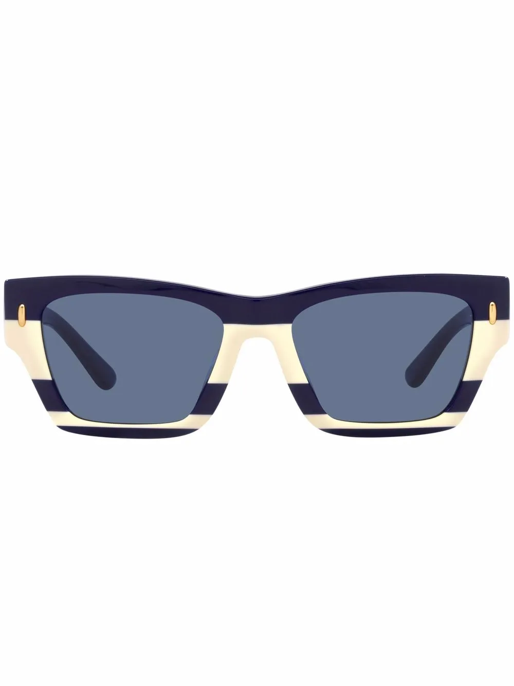 Cream/navy blue stripe-print frame sunglasses from TORY BURCH featuring gold-tone logo plaque, blue tinted lenses, square frame, straight arms and curved tips. These glasses come with a protective case..