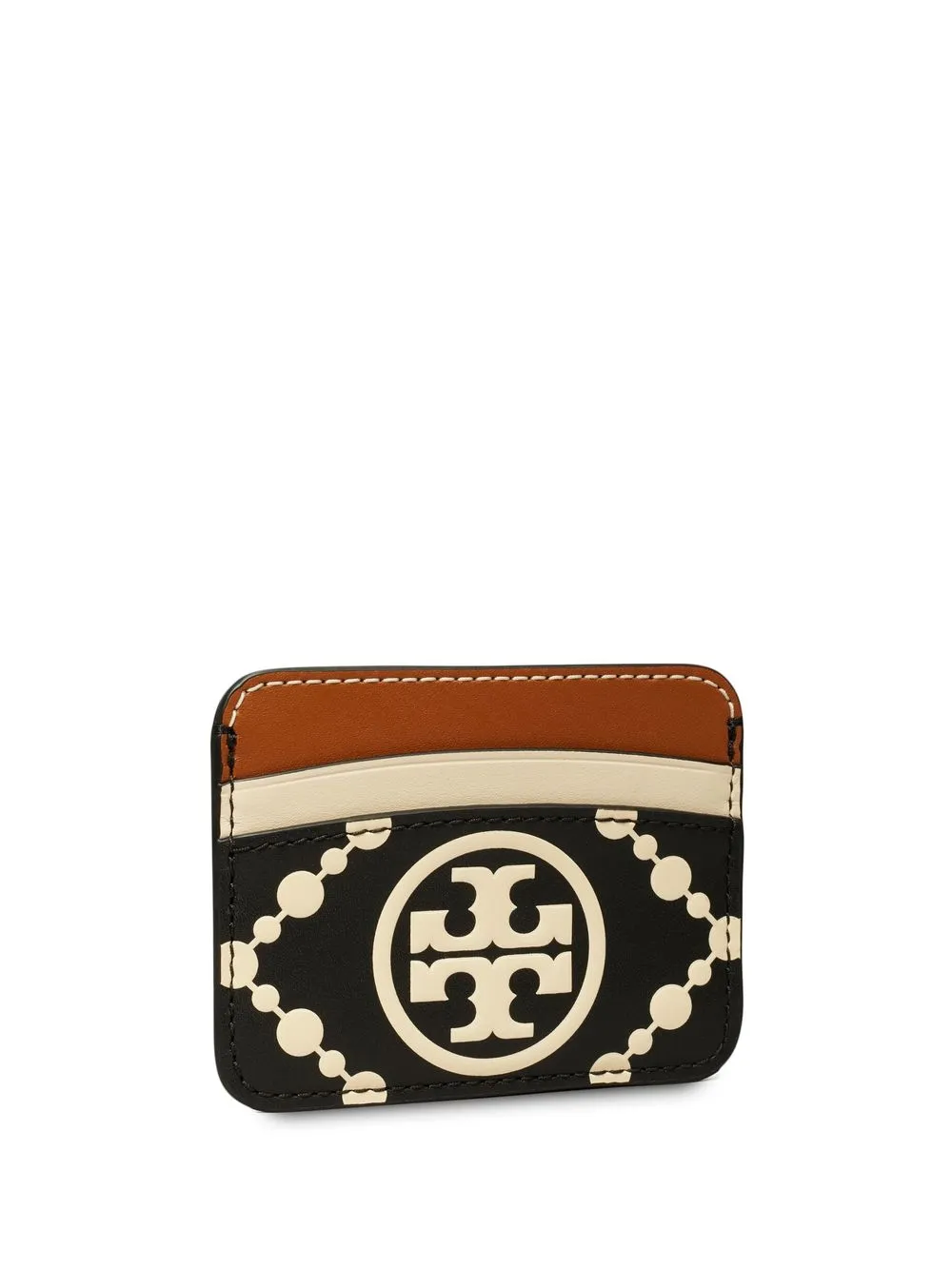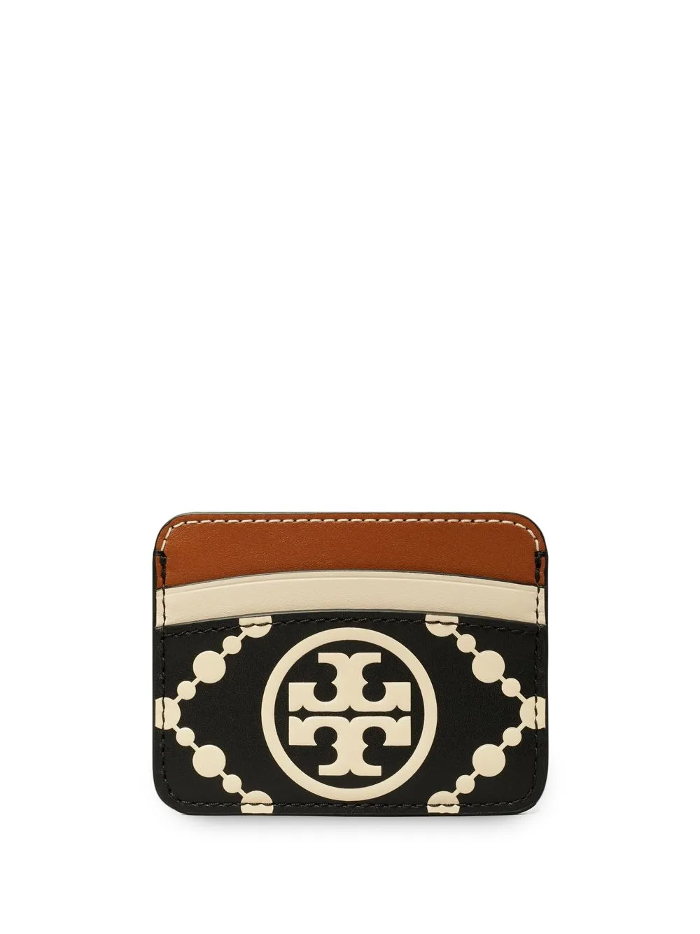 T monogram contrast embossed card case from TORY BURCH featuring black/multicolour, leather, embossed monogram pattern, signature Double T motif and card slots.