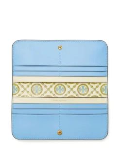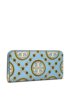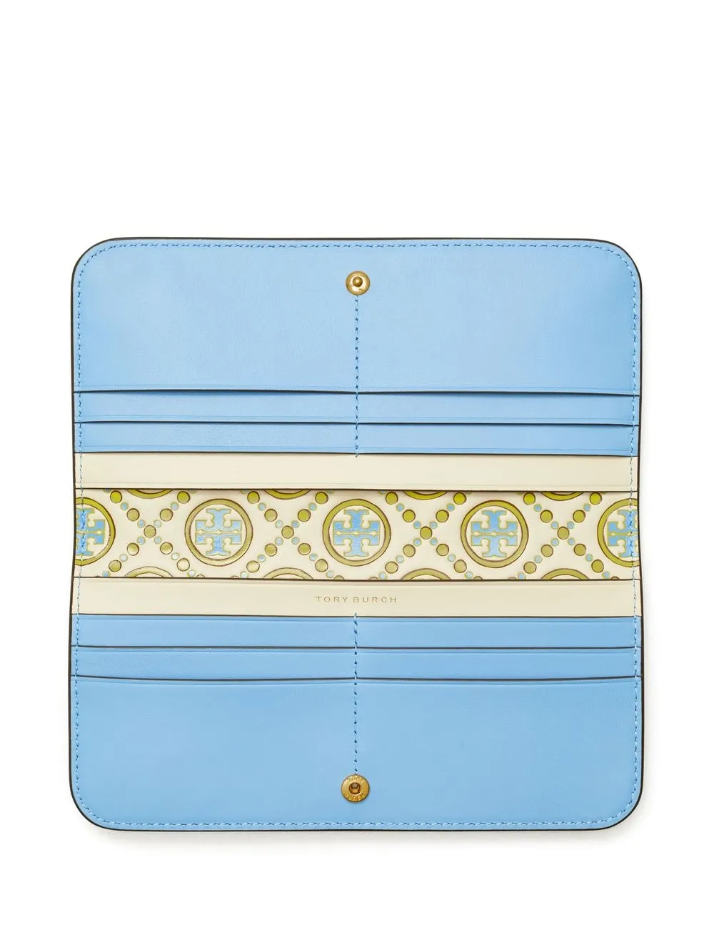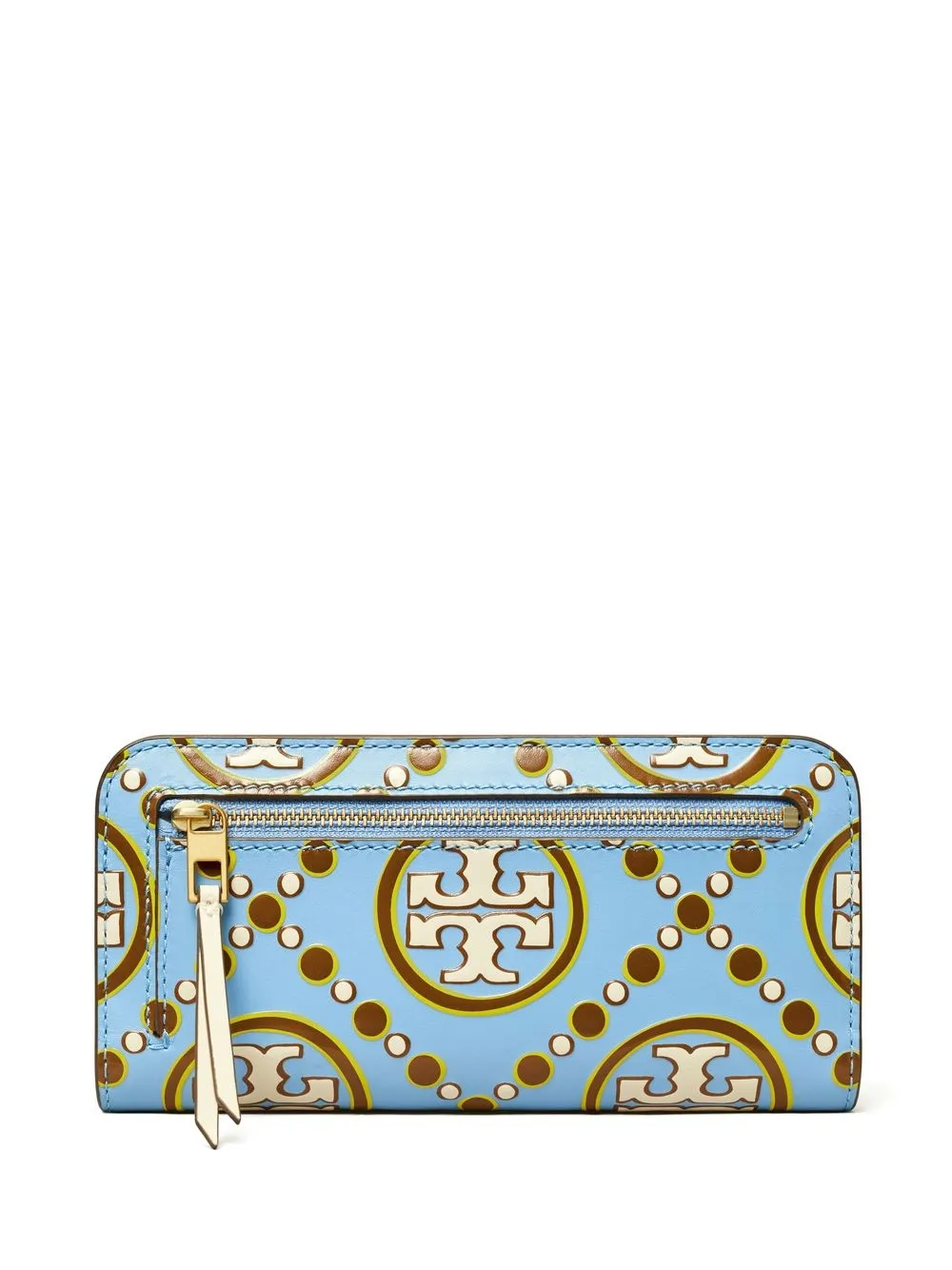T monogram contrast embossed zip wallet from TORY BURCH featuring baby blue, multicolour, calf leather, embossed monogram pattern, signature Double T motif, foldover top with press-stud fastening, zip-fastening compartment and internal card slots.