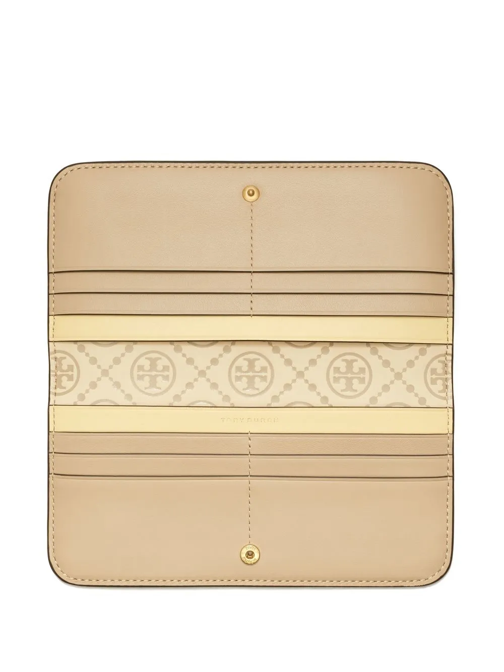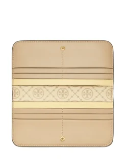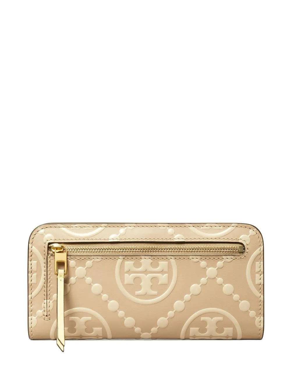 T monogram contrast embossed zip wallet from TORY BURCH featuring beige, cream white, calf leather, leather, embossed monogram pattern, signature Double T motif, front zip-fastening pocket and card slots.