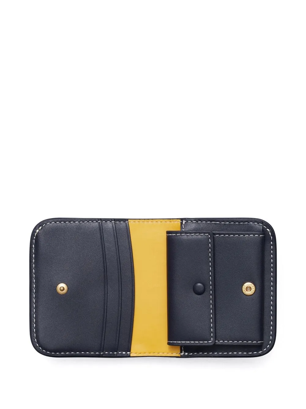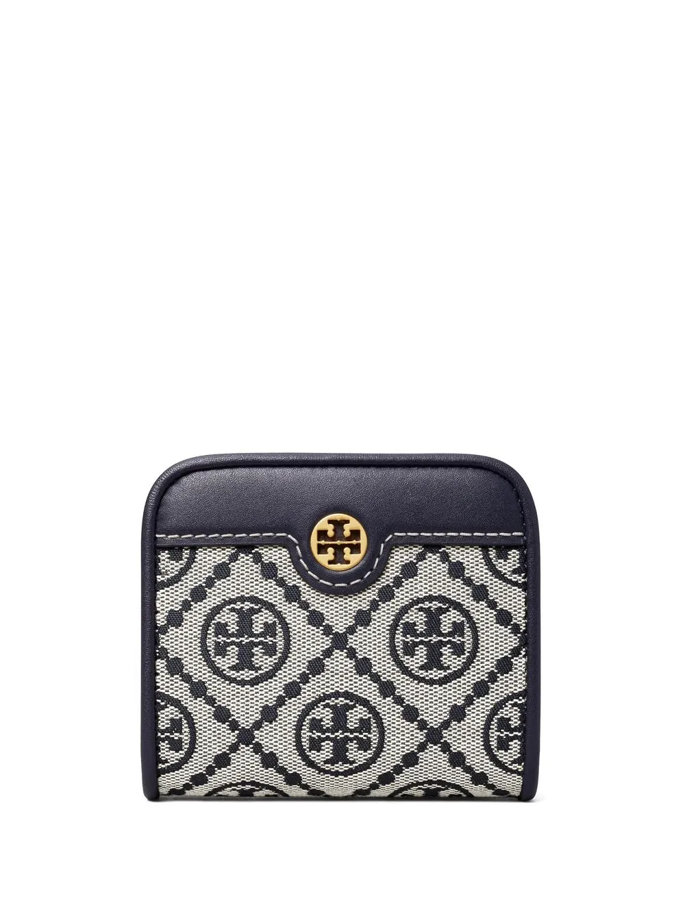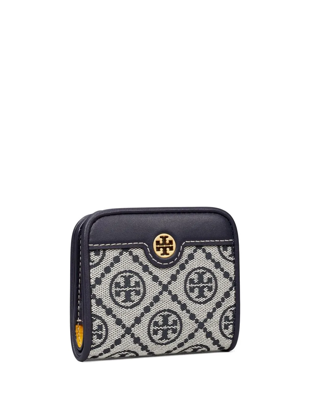 T-Monogram jacquard wallet from TORY BURCH featuring navy blue, leather, gold-tone hardware, panelled design, full jacquard, logo plaque, all-around zip fastening, snap-fit fastening, coin pocket and card slots.