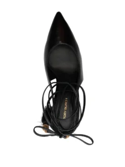 tassel-detail leather pumps from TORY BURCH featuring black, leather, goatskin, tassel detail, gold-tone stud detailing, pointed toe, branded leather insole, tie-fastening ankle strap and mid sculpted heel.
