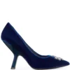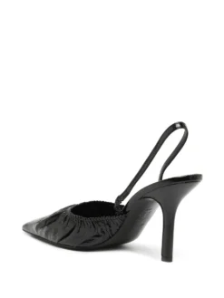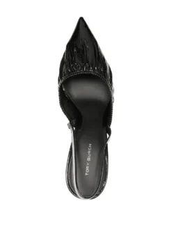 textured slingback high heel pumps from TORY BURCH featuring black, leather, textured finish, satin finish, pointed toe, slingback strap and high stiletto heel.