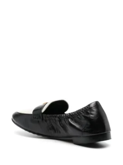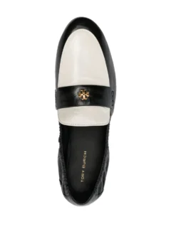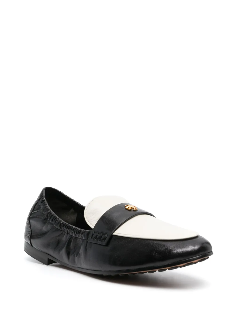 two-tone ballerina loafers from TORY BURCH featuring black/white, calf leather, gold-tone logo plaque, two-tone design, almond toe, slip-on style, branded leather insole and flat rubber sole.