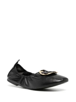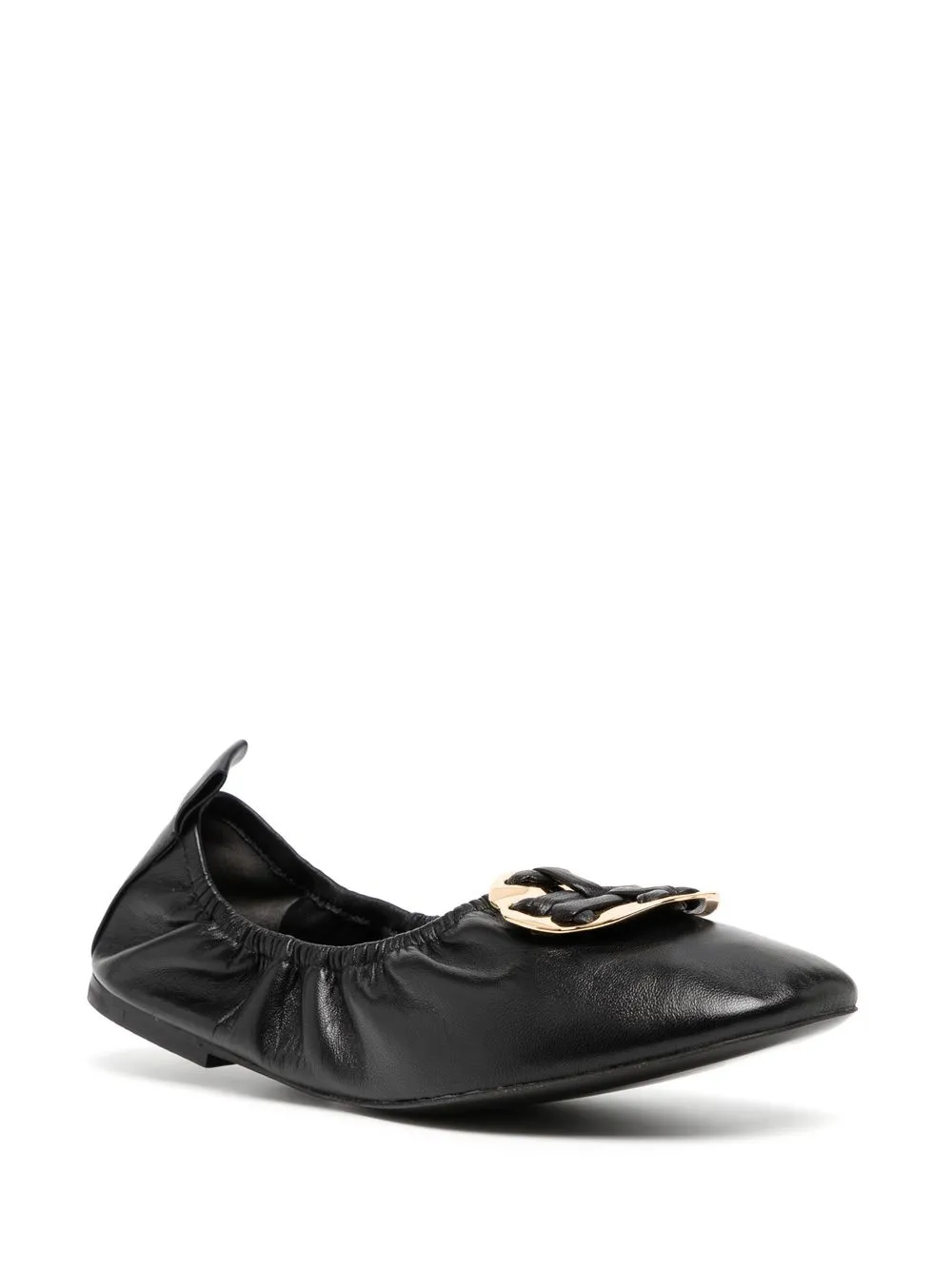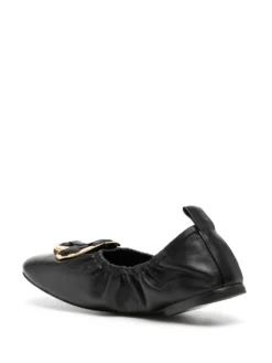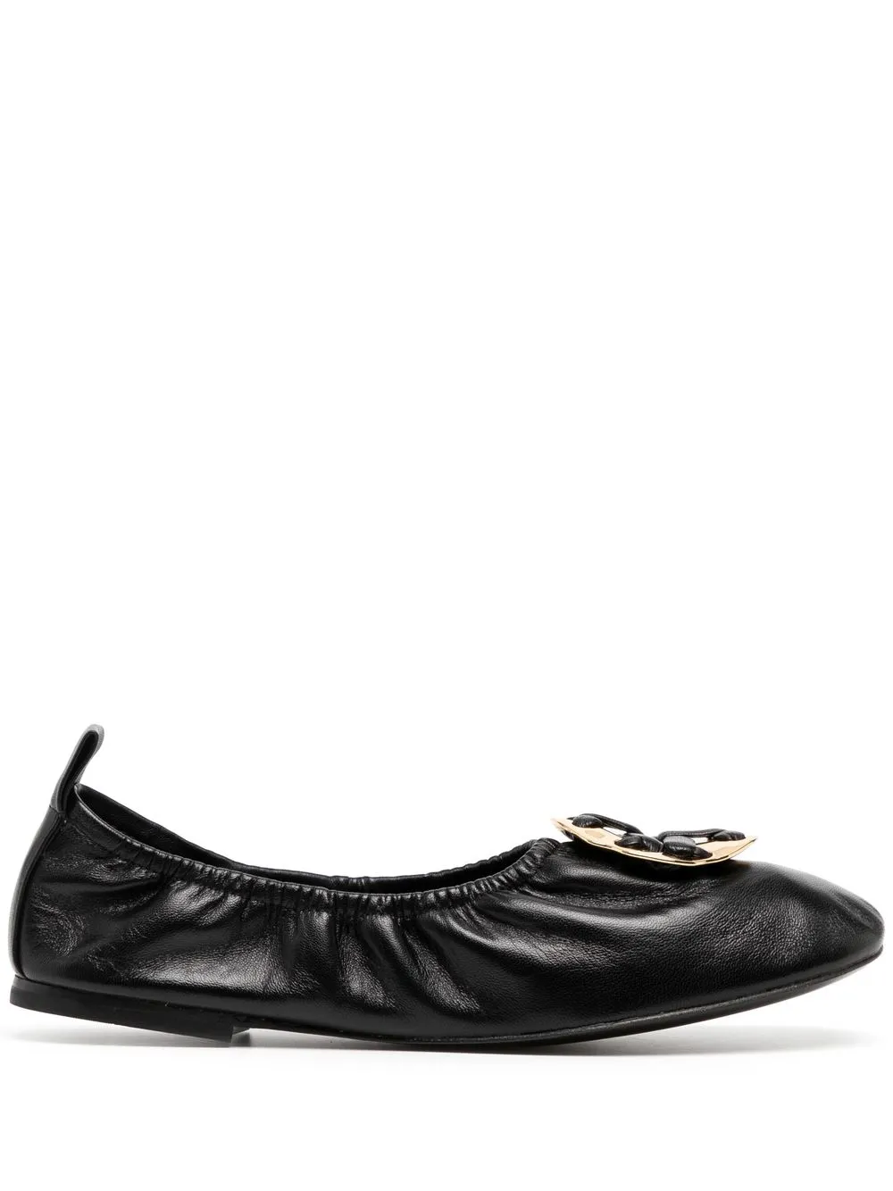 Woven Double T 10mm ballerina shoes from TORY BURCH featuring black, calf leather, signature Double T motif, round toe, branded leather insole, elasticated band, low heel and leather outsole.