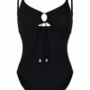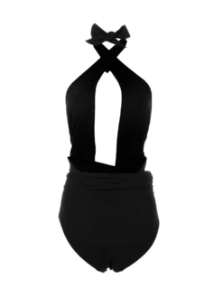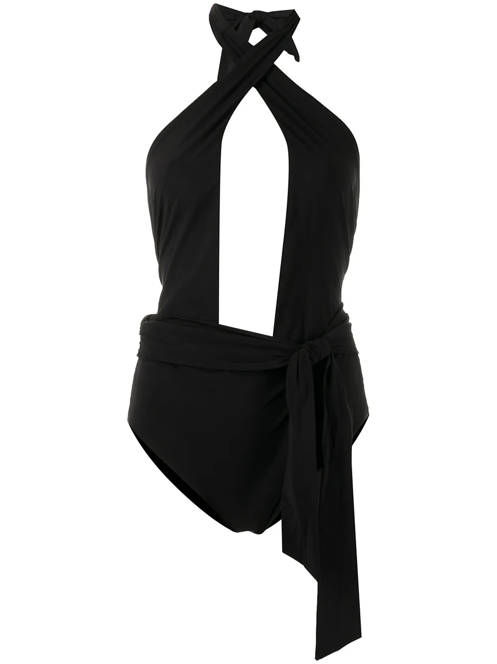 Black wrap halterneck swimsuit from TORY BURCH featuring halterneck tie fastening, open back and tied waist.